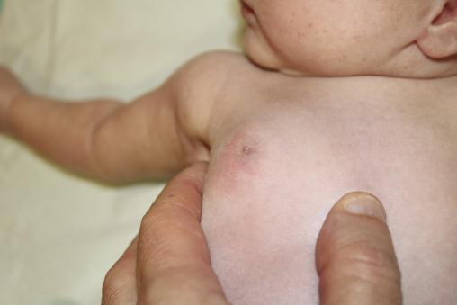 La maman de Célia (3 semaines) a remarqué depuis quelques jours une modification du sein droit de sa fille, qui est gonflé, rouge et très ferme. L’examen montre également un écoulement de pus.