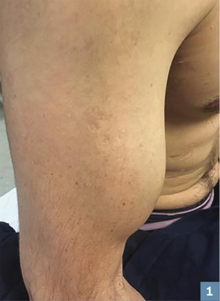L’examen clinique montre une déformation fortement évocatrice d’une rupture du chef long du biceps (fig. 1 ). La palpation est douloureuse au niveau du tiers supérieur de son faisceau long ; une masse musculaire rétractée est retrouvée à proximité de l’insertion distale sur le radius. Les mobilisations actives en antépulsion et en rotation externe sans résistance sont douloureuses mais on ne constate pas de limitation d’amplitude.