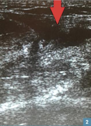 L’échographie montre une zone hétérogène hypo-échogène (grand axe de 4 cm) « coupant » le muscle (fig. 2 ).