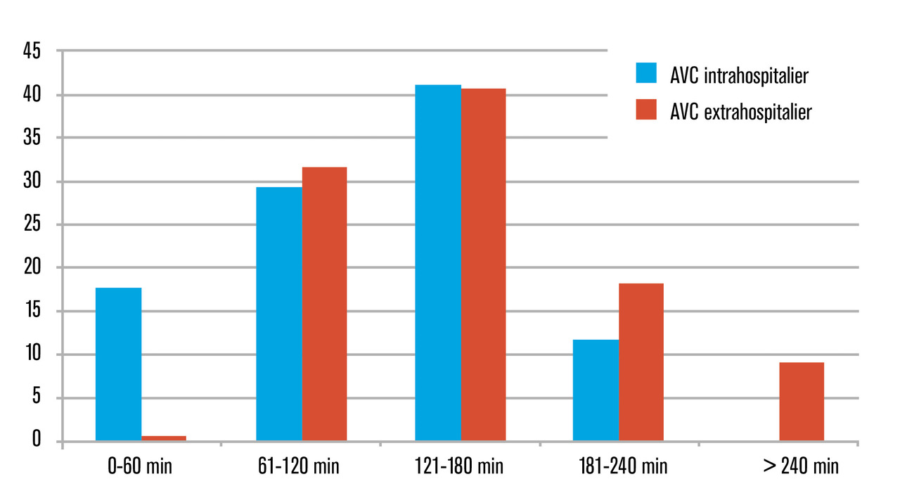 Les difficultés de reconnaissance des symptômes chez les patients ayant un AVC à l’hôpital entraînent souvent des délais importants pour l’accès aux traitements de reperfusion, alors même que le patient est déjà hospitalisé. Ces délais sont aussi liés à l’organisation de certains centres hospitaliers, répartis sur plusieurs sites, nécessitant des transferts inter-sites parfois très chronophages. Une étude réalisée en 2017 au centre hospitalier universitaire (CHU) de Lille, qui est organisé en plusieurs sites, a mis en évidence des délais voisins, pour l’accès aux traitements de reperfusion, entre les patients ayant un AVC survenu dans ou en dehors du milieu hospitalier alors même que les premiers étaient déjà hospitalisés (fig. 2 ).9 Dans cette même étude réalisée au CHU de Lille, on observe un pronostic fonctionnel relativement similaire entre les deux groupes de patients en analyse multivariée.