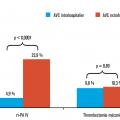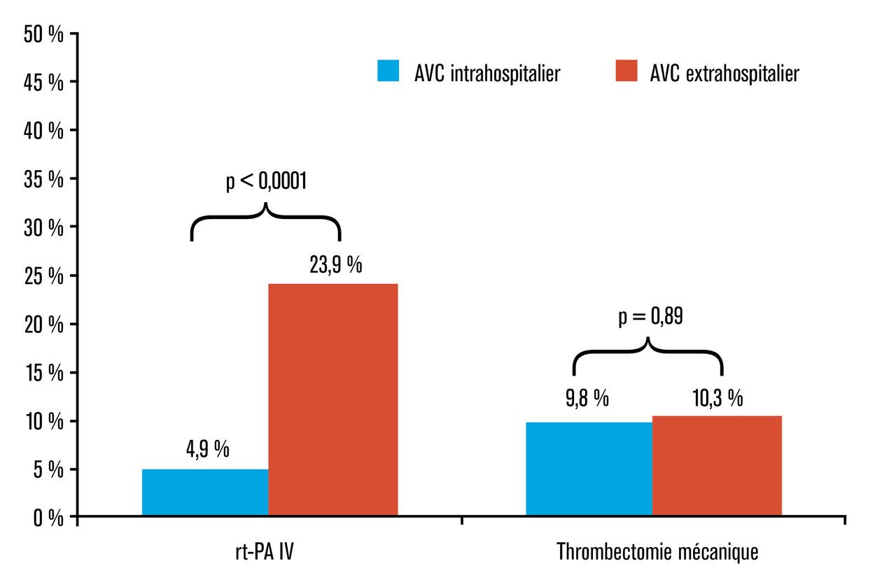 Au-delà des difficultés de reconnaissance des symptômes, l’AVC survenant en cours d’hospitalisation pose également le problème de la difficulté de sa prise en charge et notamment de la gestion des traitements de reperfusion. La plupart des situations à risque d’AVC dans ce contexte (chirurgie récente, arrêt d’un traitement anticoagulant pour une complication hémorragique) sont en effet des contre-indications à la thrombolyse intraveineuse. Néanmoins, dans toutes ces situations, et en cas d’occlusion proximale, une thrombectomie mécanique peut être envisagée. Une étude récente, réalisée sur une population de près de 2 000 patients, montre un taux de thrombolyses significativement inférieur chez les patients victimes d’un AVC survenant en milieu hospitalier comparativement à ceux dont l’AVC était extrahospitalier , mais contrastant avec des taux de thrombectomie mécanique équivalents (fig. 1 ).8