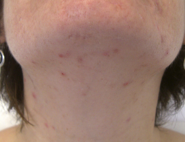 Cette forme a des spécificités cliniques : il s’agit d’une acné légère voire minime à modérée (les formes sévères sont rares), prédominant sur le menton (figure) et la mandibule avec une atteinte périorale fréquente. Une aggravation prémenstruelle est souvent décrite. Son évolution est chronique et récidivante. Elle peut être difficile à traiter, car elle ne répond pas bien à l’antibiothérapie locale ou systémique voire à l’isotrétinoïne. Le rôleaggravant du tabac est clairement établi.
