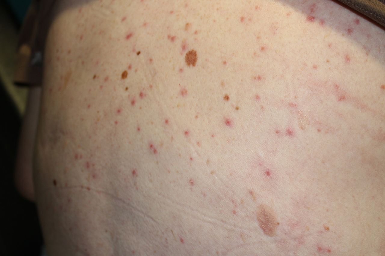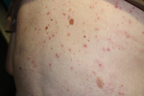 Cliniquement, l’acné survient au décours du traitement – le délai varie entre quelques jours à quelques semaines. Les lésions sont alors maculopapuleuses ; elles peuvent être en dôme. Quelques pustules, des comédons ou des kystes sont aussi observés.