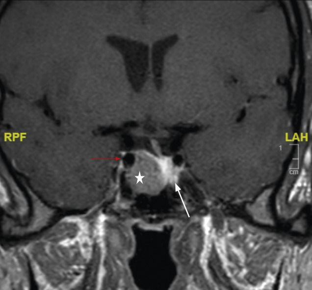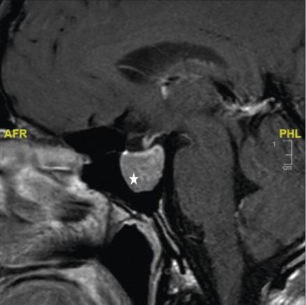 La réalisation d’une IRM hypophysaire permet de visualiser la tumeur (fig. 3, 4 et 5), d’évaluer sa taille et son éventuelle extension aux structures adjacentes.