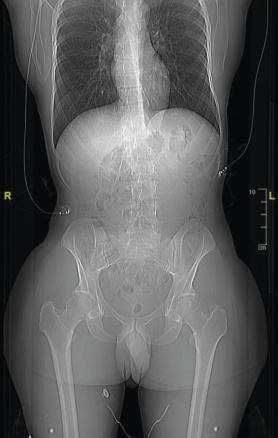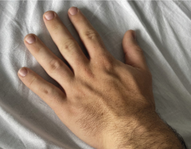 • Il mesure 1,91 m et pèse 92 kg. L’examen révèle une cyphose et une scoliose (fig. 1). Un prognathisme, une macroglossie, une hypertrophie des golfes frontaux, un élargissement des mains (fig. 2) et des pieds (il chausse du 47) ainsi que des sueurs nocturnes sont également constatés.