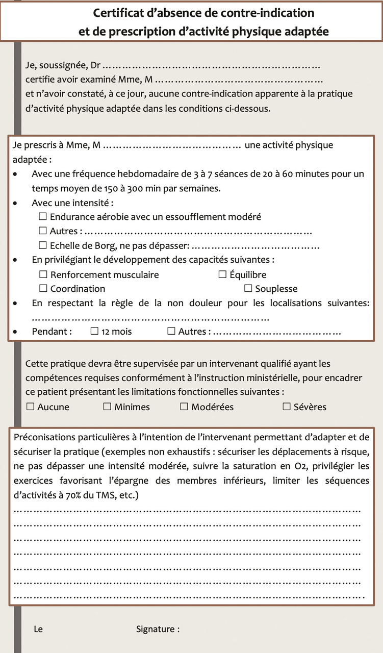 Un modèle de prescription qui synthétise l’ensemble de ces indications, et vient s’ajouter à l’ordonnance avec l’échelle de Borg, et le cas échéant à l’ordonnance de kinésithérapie, est présenté en