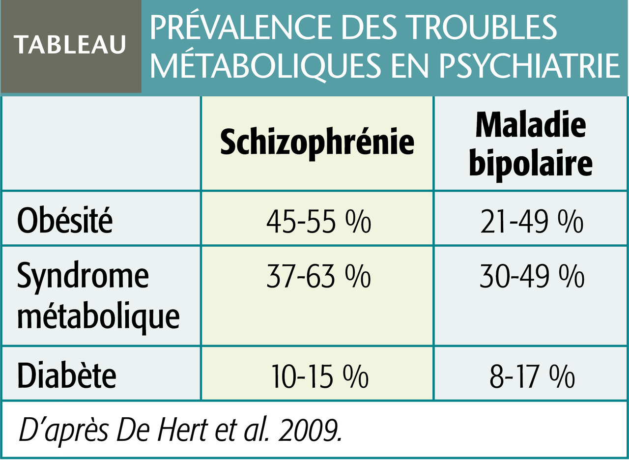 Plus précisément, chez les sujets schizophrènes, la mortalité prématurée liée aux causes cardiovasculaires est doublée. Les maladies métaboliques sont, d’une manière générale, largement surreprésentées, alors que leur prise en charge est nettement moins bonne que celle proposée à la population générale.2 À titre d’exemple, seuls 69 % des diabétiques souffrant de schizophrénie reçoivent un traitement adapté. Ce taux baisse à 30 % quand il y a une hypertension artérielle, et à 4,6 % en cas de dyslipidémie.3