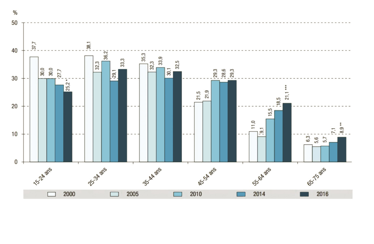 Après une baisse entre 2000 et 2005, puis une hausse entre 2005 et 2010, le tabagisme des Français s’est stabilisé jusqu’en 2010, pour les hommes comme pour les femmes.