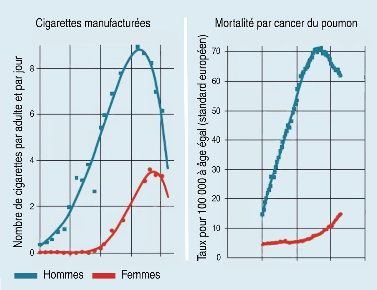En 2016, 31 % des femmes se déclaraient fumeuses, contre 38 % des hommes. On observe une augmentation du tabagisme chez les femmes âgées de plus de 55 ans (fig. 1).L’augmentation de la consommation féminine, corollaire de l’émancipation, a provoqué une augmentation du cancer bronchique féminin qui s’est multiplié par 4 en 15 ans, avec des prévisions très sombres pour les années à venir (fig. 2). Actuellement, l’incidence du taux de mortalité par cancer bronchique est supérieure chez la femme à celle de la mortalité par cancer du sein.