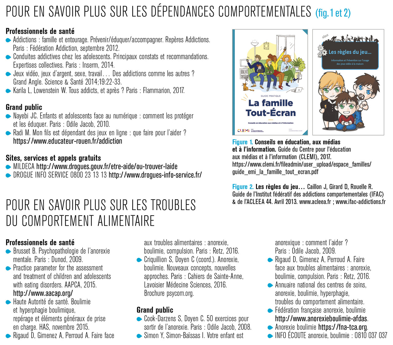 l sur l’existence d’un réseau spécialisé et de l’offre de soins en précisant leur anonymat et gratuité. Cette information doit être accompagnée d’une documentation (en salle d’attente ou remise en main propre) : brochures, guides gratuits de conseils (pour les parents, pour les professionnels), adresses utiles disponibles en ligne*** ou par courrier (v. encadré et fig. 1 et 2 ) ;