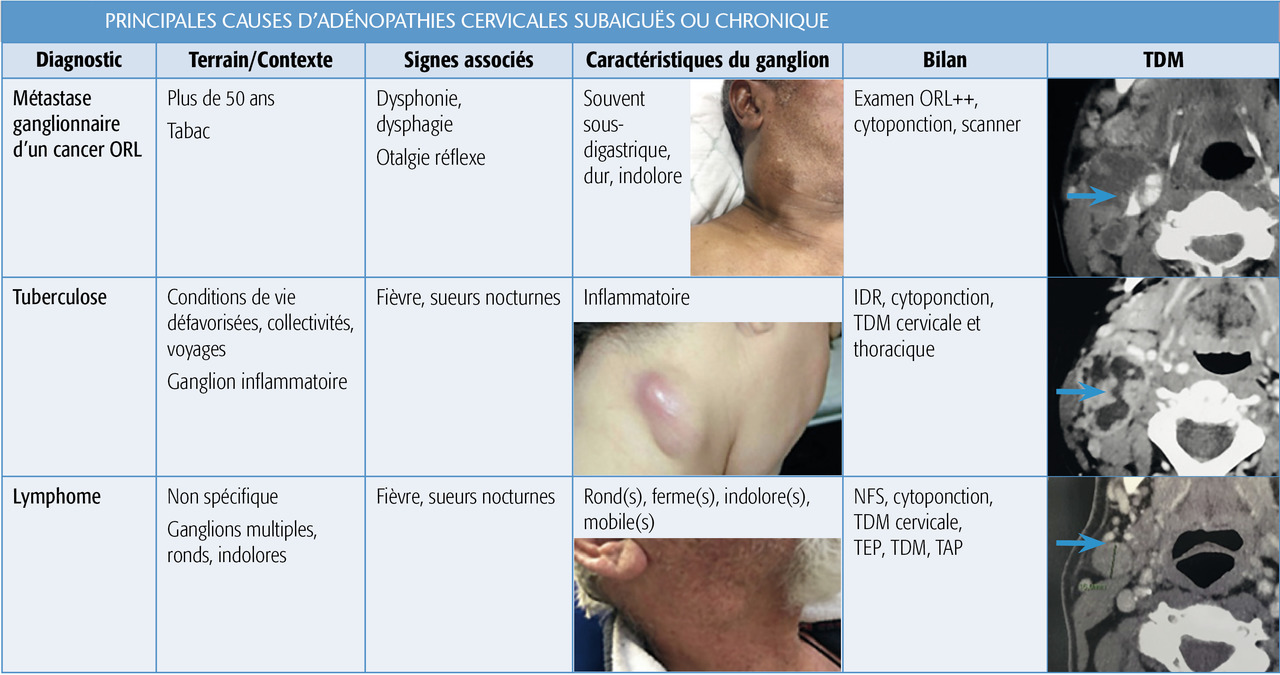 ✔ Unique : diagnostic différentiel (kyste branchial, chémodectome – tumeur bénigne développée à partir du glomus carotidien – , lipome, lymphangiome), cancer ORL, tuberculose