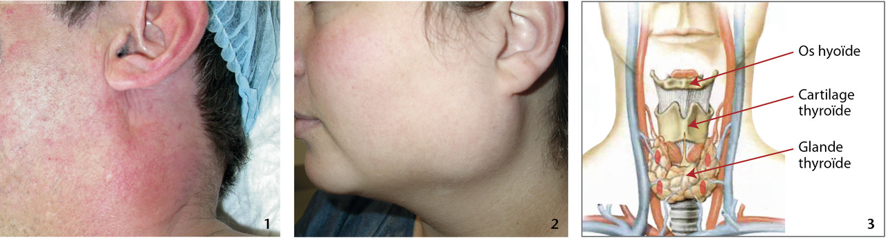 • Kyste du tractus thyréoglosse : haut, en regard de l’os hyoïde, antécédents d’épisodes inflammatoires éventuels (fig. 3)