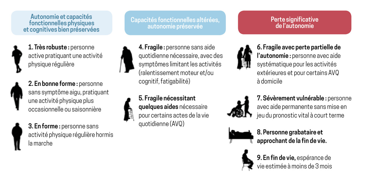 Aucune définition ne fait l’unanimité. Mais peu importe le nombre d’années, ce qui compte est davantage l’autonomie de la personne et ses capacités fonctionnelles. Dans la société actuelle, à partir de 80 ans, une grande partie de la population est très fragile, a plusieurs comorbidités, une polymédication et des troubles importants des capacités fonctionnelles et de l’autonomie. Ainsi, dans cette tranche d’âge, il s’agit de distinguer les plus robustes des plus fragiles, car les objectifs et les stratégies thérapeutiques seront différents. Nous avons récemment repris une échelle visuelle de l’état fonctionnel et du profil de fragilité et d’autonomie du patient âgé, proposée il y a plusieurs années par une équipe canadienne.1 Elle permet d’adopter un « langage commun » car l’interprétation des termes de fragilité et de fonctionnalité peut diverger selon les acteurs (figure ).2