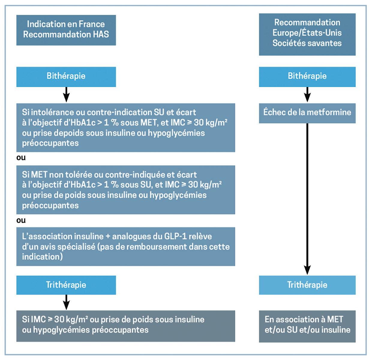Selon la Société francophone de diabétologie (SFD), ils devraient être l’option thérapeutique préférée lorsque l’objectif glycémique ne peut pas être obtenu sous metformine seule chez les patients à haut risque vasculaire dont l’IMC est supérieur à 30 kg/m².1
