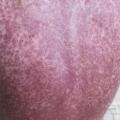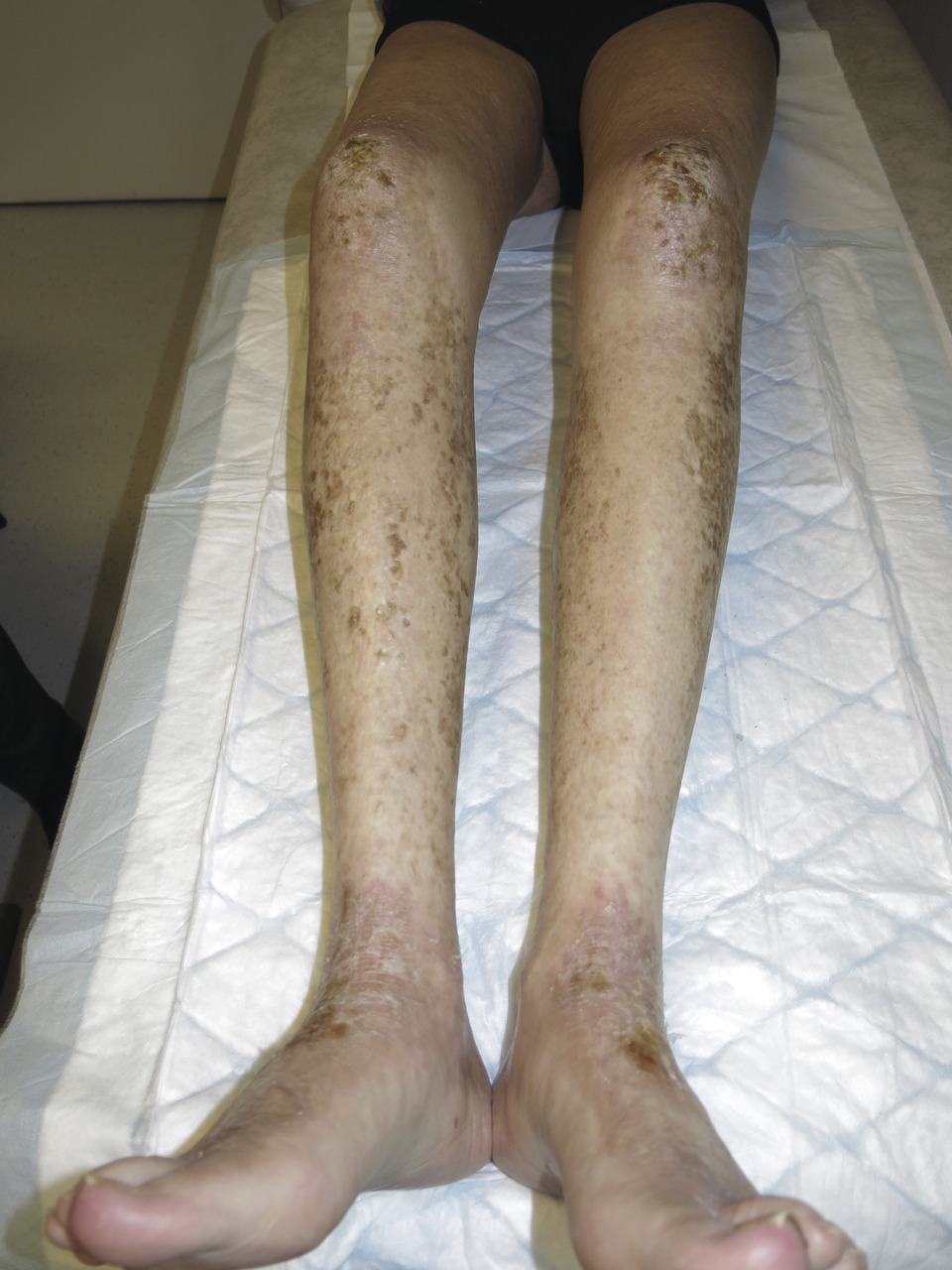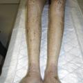 Ses manifestations s’apparentent davantage à des maladies auto-immunes avec des lésions sclérodermiformes (fig. 7 ), eczématiformes (fig. 8 ), le syndrome sec, le lichen, la bronchiolite oblitérante ou la myosite. Comme son nom l’indique, la GvHD chronique peut durer pendant des années, et est source de morbi-mortalité importante altérant considérablement la qualité de vie des patients allogreffés.
