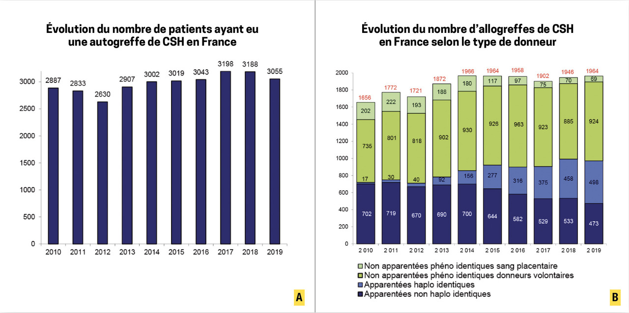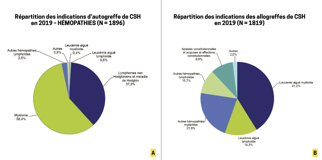 En France, près de 5 000 patients ont reçu une greffe de CSH au cours de l’année 2019, dont environ 60 % de greffes autologues et 40 % de greffes allogéniques (fig. 1A et 1B ).3