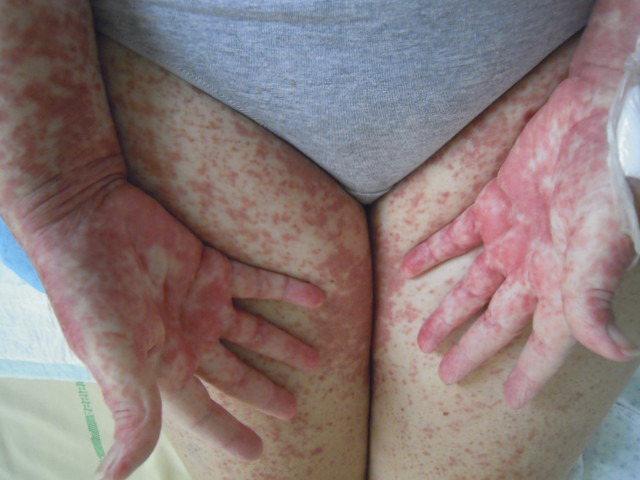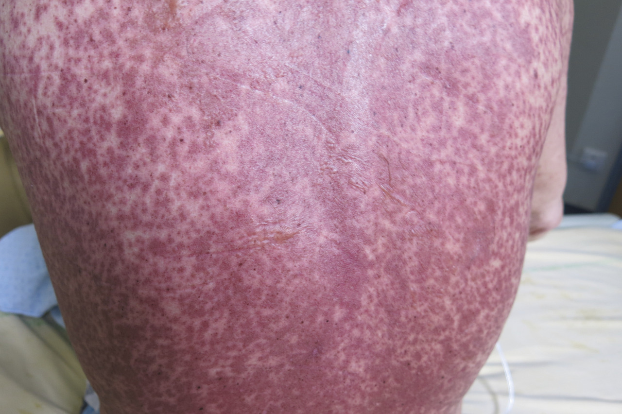 En revanche, la GvHD est la principale complication immunologique observée après une allogreffe. Elle résulte de l’activation des cellules immunocompétentes du donneur (lymphocytes T matures) par les cellules présentatrices d’antigènes, dans un environnement cytokinique propice. La GvH aiguë apparaît classiquement dans les 100 premiers jours et se manifeste par une inflammation de la peau (simple érythème maculo-papuleux localisé allant jusqu’au décollement bulleux Lyell-like [