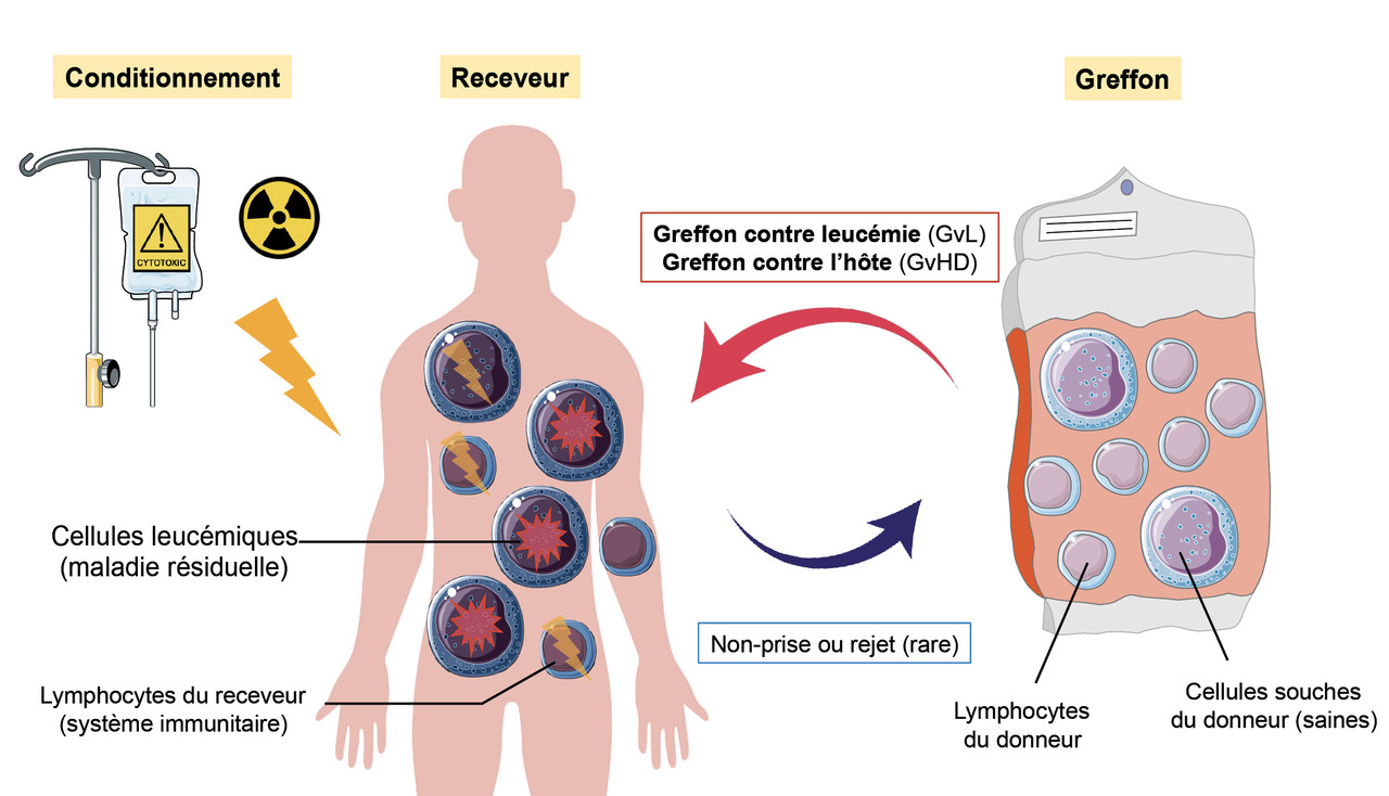 La greffe de CSH consiste à remplacer les CSH et le système immunitaire d’un patient par ceux issus du patient lui-même (autogreffe) ou d’un donneur de la même espèce (allogreffe), à la suite d’une courte phase de chimio- et/ou radiothérapie appelée « conditionnement ». Dans les jours suivant l’injection, les CSH colonisent la moelle osseuse du receveur et reconstituent les trois lignées sanguines en deux à quatre semaines. Les cellules lymphocytaires du système immunitaire, quant à elles, s’expandent dans le sang et les tissus lymphoïdes, et peuvent – dans le cas spécifique d’une allogreffe – reconnaître les cellules malignes du receveur comme étrangères et produire une réponse antitumorale (effet graft-versus-leukemia/lymphoma, ou GvL).
