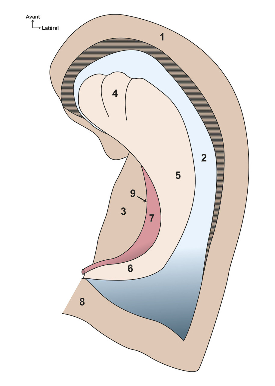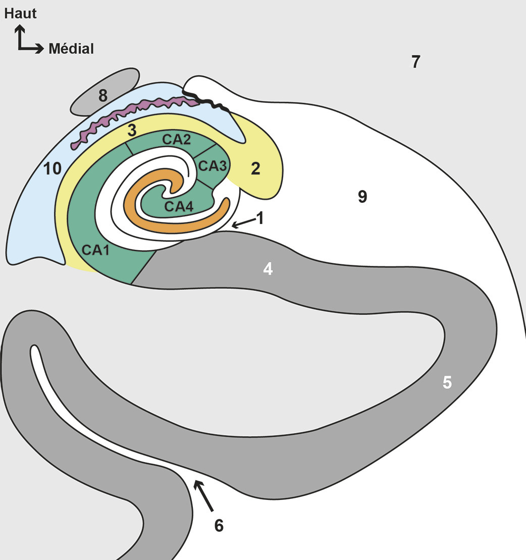 Les deux lames corticales enroulées de l’hippocampe, la corne d’Ammon et le gyrus dentatus, sont séparées du subiculum par le sillon de l’hippocampe dont la partie profonde forme le sillon hippocampique vestigial (fig. 3 ). Elles sont recouvertes par la fimbria, venant du fornix, et par l’alveus, couche de fibres de substance blanche, et font ainsi saillie dans la corne temporale du ventricule latéral, elle-même surplombée par la queue du noyau caudé.