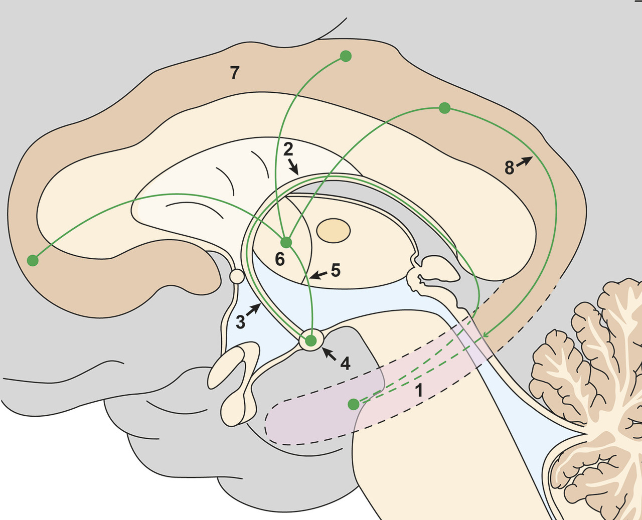 Les travaux de James Papez (1883-1958) en 1937 puis ceux de Paul MacLean (1913-2007) entre 1949 et 1952 ont transformé le lobe limbique morphologique en un système limbique dont les fonctions dans les émotions et la mémoire ont agrandi le périmètre à d’autres structures nucléaires du thalamus ou de l’hypothalamus, par exemple. Le modèle de circuit neuronal proposé par Papez demeure classique, même s’il est aujourd’hui dépassé sur le plan fonctionnel. Toutes les voies prédites par Papez sont néanmoins présentes dans le cerveau (fig. 5 ). Dans ce concept, l’hippocampe est relié au corps mamillaire par l’intermédiaire du fornix. Le corps mamillaire communique avec les noyaux ventraux du thalamus par le faisceau mamillo-thalamique. Les noyaux thalamiques projettent sur le gyrus cingulaire qui émet à son tour des fibres cingulo-hippocampiques assurant un retour vers l’hippocampe. Les lésions de ce circuit fermé sont en effet capables d’induire des troubles mnésiques, mais ce réseau de fonctionnement n’est plus la base des concepts théoriques actuels sur la mémoire.