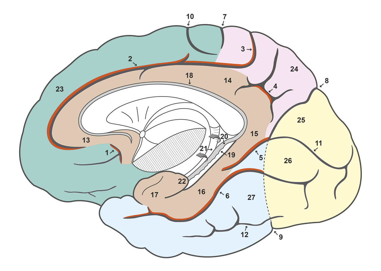 Le gyrus limbique se place en dedans de cette fissure et recouvre donc une partie des lobes frontal, pariétal et temporal. Il est formé des gyrus subcalleux, cingulaire et parahippocampique (cinquième gyrus temporal T5). Le gyrus parahippocampique possède une partie postérieure, l’isthme, qui communique avec le gyrus cingulaire et une face supérieure aplatie, le subiculum.