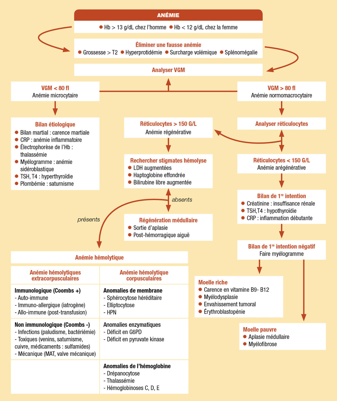 Avant de se lancer dans les explorations d’une anémie, il faut avant tout vérifier l’absence d’une fausse anémie par hémodilution : grossesse à partir du 2e trimestre, hypoprotidémie (immunoglobuline monoclonale, notamment IgM), surcharge volémique (insuffisance cardiaque, rénale ou hépatocellulaire) et splénomégalie.