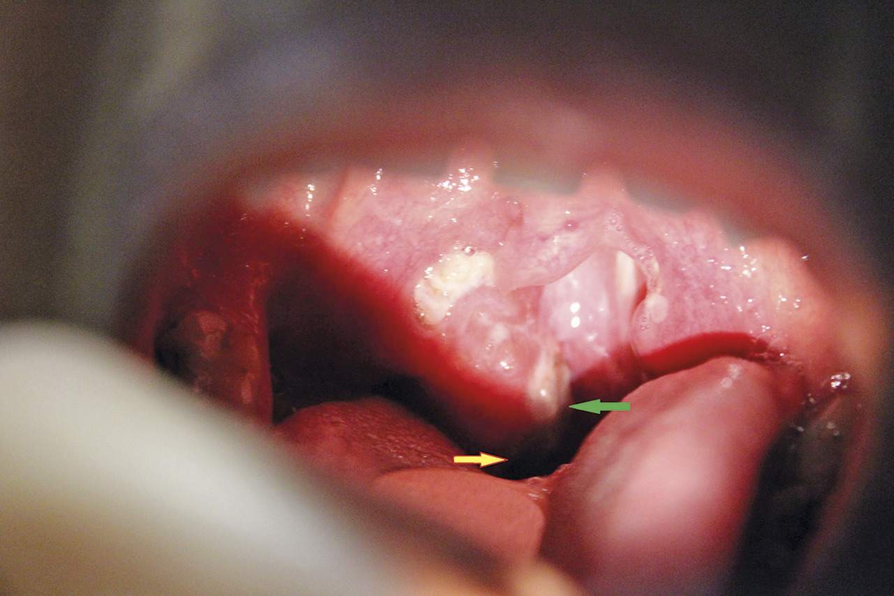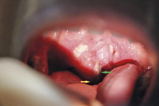 Damien, 25 ans, SDF, consulte car il a depuis 72 heures une douleur pharyngée unilatérale accompagnée de fièvre ; il ne peut plus avaler. L’examen montre, au niveau de l’amygdale droite, une angine blanche (enduit), mais aussi une ulcération (flèche jaune) et des membranes grises (flèche verte).