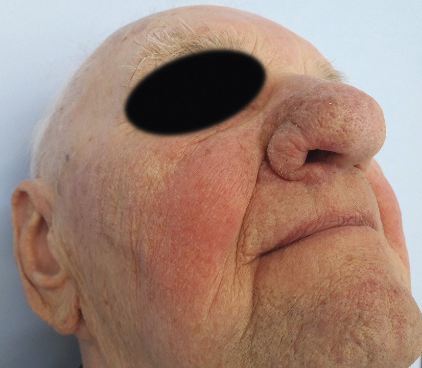 Cet homme de 87 ans, diabétique et hypertendu, avait depuis 4 mois une tuméfaction du nez augmentant progressivement de taille. L’examen clinique révélait un important rhinophyma et la présence d’une volumineuse masse violacée indurée siégeant sur l’aile droite du nez, mesurant 4 cm de grand axe, surmontée d’une érosion (fig. 1 et 2 ), ainsi qu’une infiltration de la peau de la joue droite et un rétrécissement de la fente palpébrale homolatérale. Le reste de l’examen clinique était sans particularité. La biopsie cutanée précisait le diagnostic d’angiosarcome. L’étendue de la lésion ne permettait pas un traitement chirurgical, et des cures hebdomadaires de paclitaxel étaient initiées après concertation pluridisciplinaire. L’évolution était favorable après 15 cures, avec une diminution considérable de la taille de la masse (fig. 3 ).