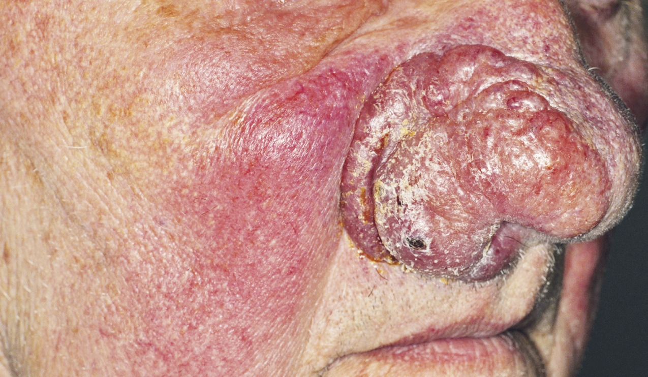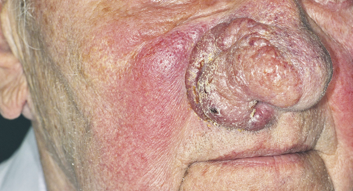 Les angiosarcomes sont des tumeurs d’évolution péjorative et de mauvais pronostic, représentant environ 1 à 2 % des sarcomes des tissus mous. Ils peuvent être primaires ou secondaires en cas d’antécédent de radiothérapie ou de lymphœdème chronique.1 La stase lymphatique chronique dans le rhinophyma est un facteur favorisant dans le développement de l’angiosarcome comme dans le syndrome de Stewart-Treves. Le traitement de choix est l’exérèse large dans les tumeurs localisées de petite taille. La radio- ou la chimiothérapie peuvent être utilisées pour les tumeurs plus grandes.2