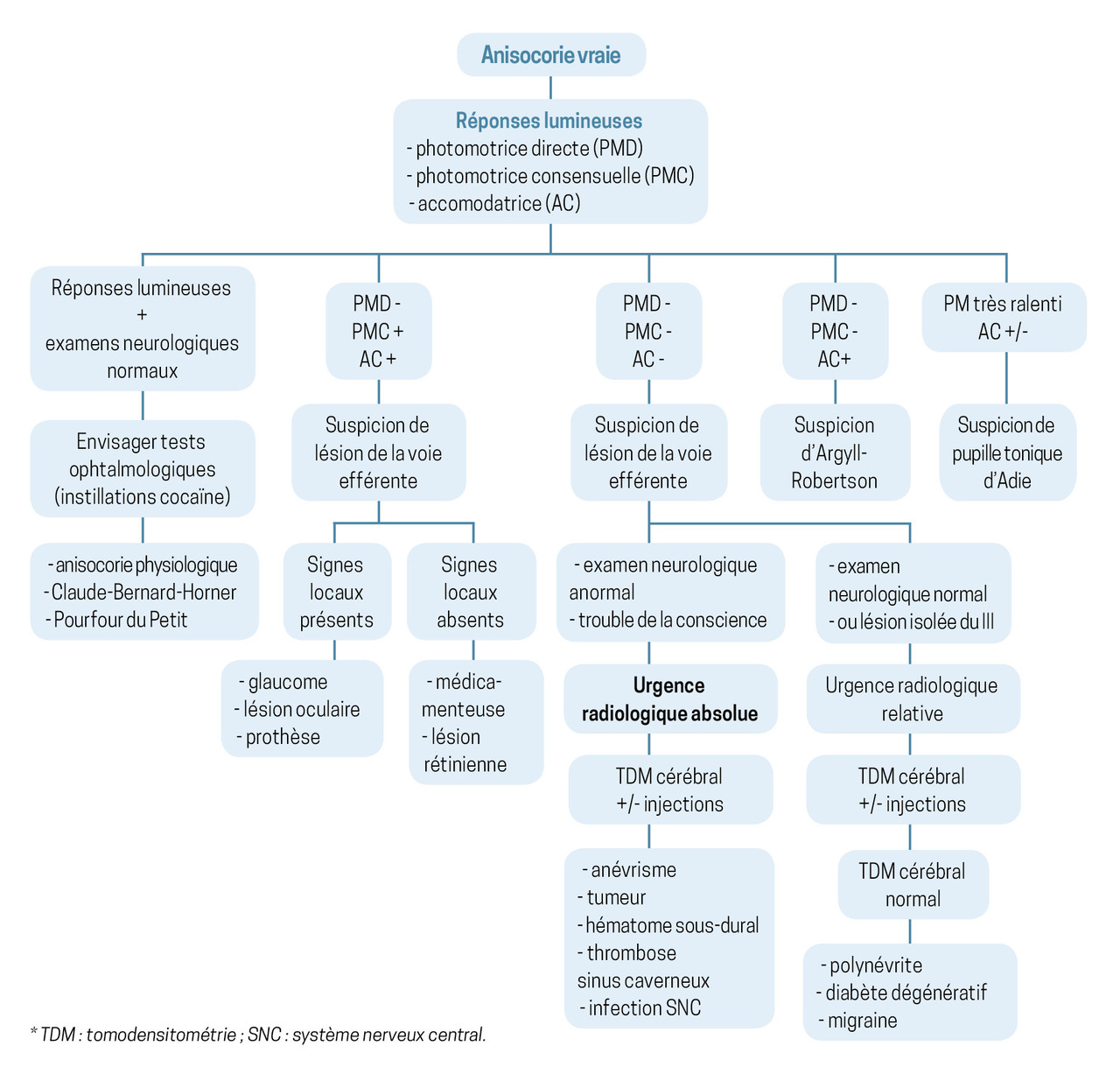 . l’absence de réflexes consensuels est signe d’une atteinte de la voie efférente (nerf oculomoteur) ou d’une paralysie du sphincter de la pupille. Les hypothèses diagnostiques sont alors nombreuses : atteinte intracérébrale (tumorale, compressive, infectieuse ou vasculaire), atteinte distale (anévrisme de l’artère communicante postérieure, accident vasculaire cérébral, neuropathie diabétique). En cas d’examen neurologique anormal, l’imagerie est une urgence absolue ;