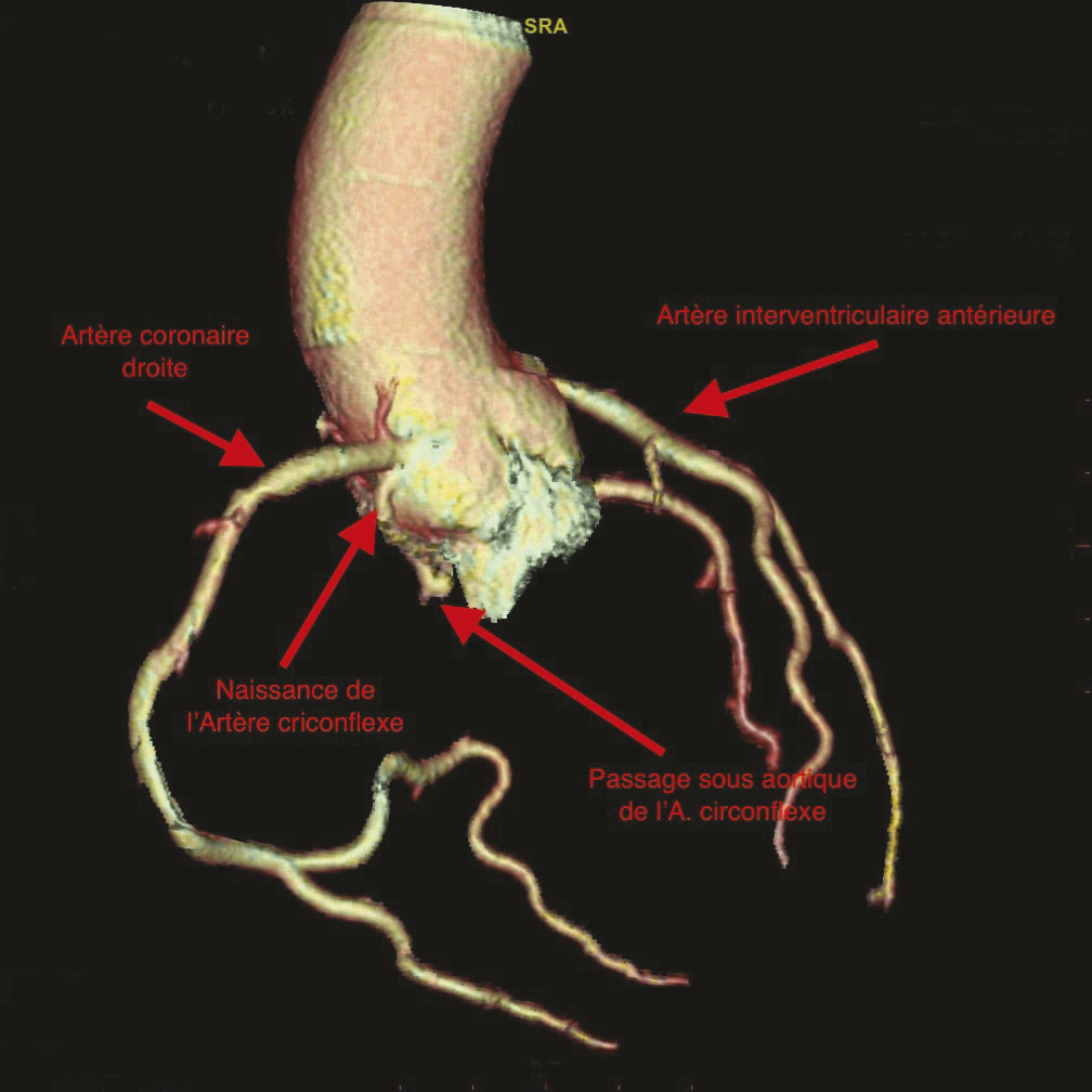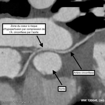 Le réseau coronaire gauche prend naissance au niveau du sinus antéro-gauche avec le tronc commun qui se divise en artère interventriculaire antérieure et artère circonflexe. Cette dernière chemine dans le sillon auriculoventriculaire gauche. Des anomalies des artères coronaires sont présentes chez 0,3 à 1,5 % de la population générale en données coronarographiques.1 Les anomalies de naissance de l’artère circonflexe représentent 17 % des anomalies de naissance des artères coronaires. La connexion ectopique de l’artère coronaire gauche peut se faire avec un passage intramural dans la paroi aortique et être ainsi à haut risque de pathologie grave, dont la mort subite.3