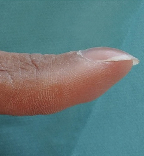 Bien connu, il est reconnaissable par une hypertrophie des phalangettes (fig. 1B). Il est à différencier du pseudo-hippocratisme digital dont les causes sont totalement différentes, en rapport avec des atteintes artérielles et osseuses acrales responsables d’une résorption phalangienne (fig. 1C). L’hippocratisme digital affecte tous les doigts de manière uniforme (parfois unilatéral) tandis que le pseudo-hippocratisme digital n’en touche que quelques-uns. La confusion peut être attribuée à l’aspect bombé que prend l’ongle dans le pseudo-hippocratisme digital, sans rapport avec une hypertrophie des phalangettes (fig. 1D).