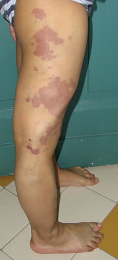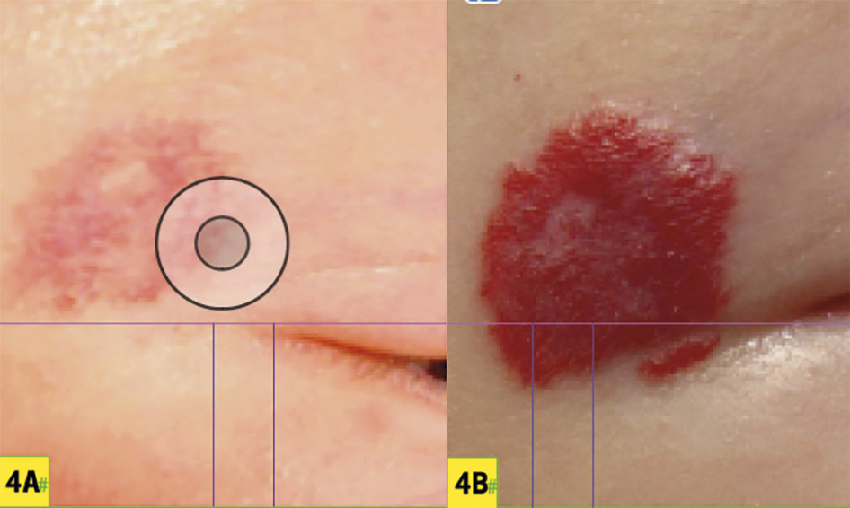 L’association à des malformations capillaires multiples de petite taille non systématisées, caractérisées par un halo clair et une teinte allant du rosé au brun clair, évoque un syndrome CM-AVM (capillary malformation-arteriovenous malformation), pathologie héréditaire (