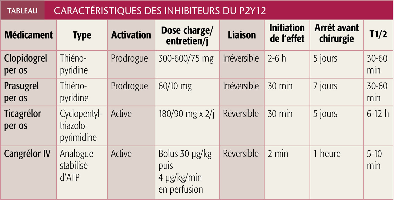 Le cangrélor (Kengrexal) administré en intraveineux a une action rapide mais brève (elle s’estompe très vite après arrêt de la perfusion). Il est peu utilisé en pratique compte tenu de son coût mais pourrait trouver sa place chez les patients incapables d’ingérer les comprimés (arrêt cardiaque, choc cardiogénique…).