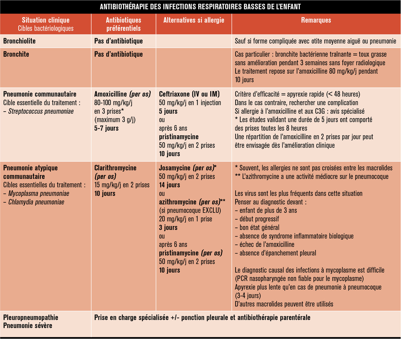 Les infections respiratoires basses sont la deuxième cause de prescription d’antibiotiques. De même que pour les infections respiratoires hautes, la plupart de ces infections sont d’origine virale et l’évolution naturelle se fait le plus souvent vers la guérison. La généralisation de la vaccination pneumococcique conjuguée chez le nourrisson a permis de réduire l’incidence globale des pneumonies et des pleurésies, et la part du pneumocoque dans ces pathologies.8 La résistance aux antibiotiques des pathogènes impliqués ayant diminué, notamment aux pénicillines et aux macrolides, cela a permis de la même façon, d’alléger les choix antibiotiques ces dernières années.