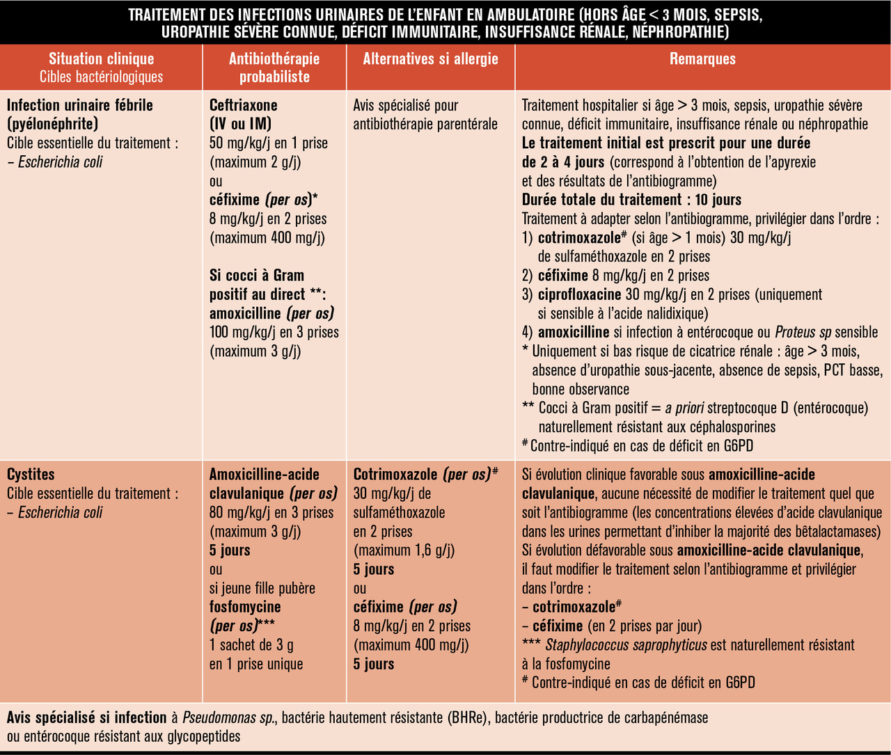 Letableau 3 présente, pour les infections urinaires, l’antibiothérapie probabiliste, les alternatives en cas d’allergie ainsi que l’antibiothérapie par voie orale à prescrire selon les résultats de la culture, en pédiatrie.5, 6 La possibilité d’un traitement par amikacine par voie intraveineuse en monothérapie (non disponible en ville) a volontairement été enlevée de ce tableau. De même, l’antibiothérapie des patients pour lesquels un traitement hospitalier est nécessaire ne figure pas dans ce tableau (âge < 3 mois, sepsis, uropathie sévère connue, déficit immunitaire, insuffisance rénale, néphropathie). Dans des situations à bas risque de cicatrices rénales, un traitement d’emblée oral par céfixime est possible (âge > 3 mois, absence d’uropathie sous-jacente, absence de sepsis, procalcitonine basse, bonne observance). Dans tous les cas, le traitement initial ne doit être prescrit que pour les 2 à 3 premiers jours et secondairement adapté aux résultats de l’antibiogramme qu’il faut récupérer rapidement dans un contexte d’émergence des entérobactéries BLSE.