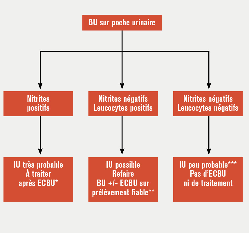Les infections urinaires sont plus rares que les infections respiratoires hautes et basses. Elles représentent, en revanche, la majorité des infections bactériennes documentées en pédiatrie. Une bandelette urinaire (BU) doit toujours être analysée, à la recherche de leucocytes ou de nitrites, avant la réalisation d’un examen cytobactériologique des urines (ECBU), car une BU négative permet d’exclure à plus de 95 % une infection urinaire (hors nouveau-né, neutropénie). En pédiatrie, la qualité du recueil des urines est essentielle. Les méthodes à privilégier sont le sondage vésical et le prélèvement en milieu de jet. L’utilisation de la poche urinaire est largement remise en cause, source de nombreux faux positifs (50 %). La figure p. 11 résume l’interprétation d’une bandelette urinaire réalisée sur une poche selon le résultat de la leucocyturie et des nitrites.9