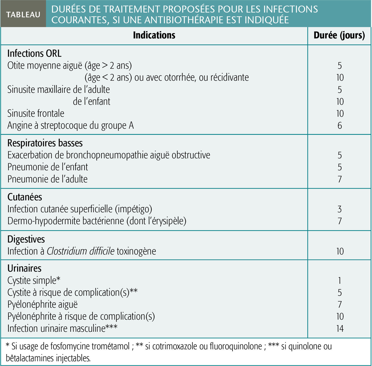 La Société de pathologie infectieuse de langue française (SPILF) s’est emparée de ce problème en publiant, en 2017, des propositions fondées sur une analyse systématique de la littérature médicale, soit des durées d’antibiothérapie qui correspondent au temps nécessaire à la guérison pour la majorité des patients, sans perte de chance (tableau).5 Trois commentaires s’imposent :