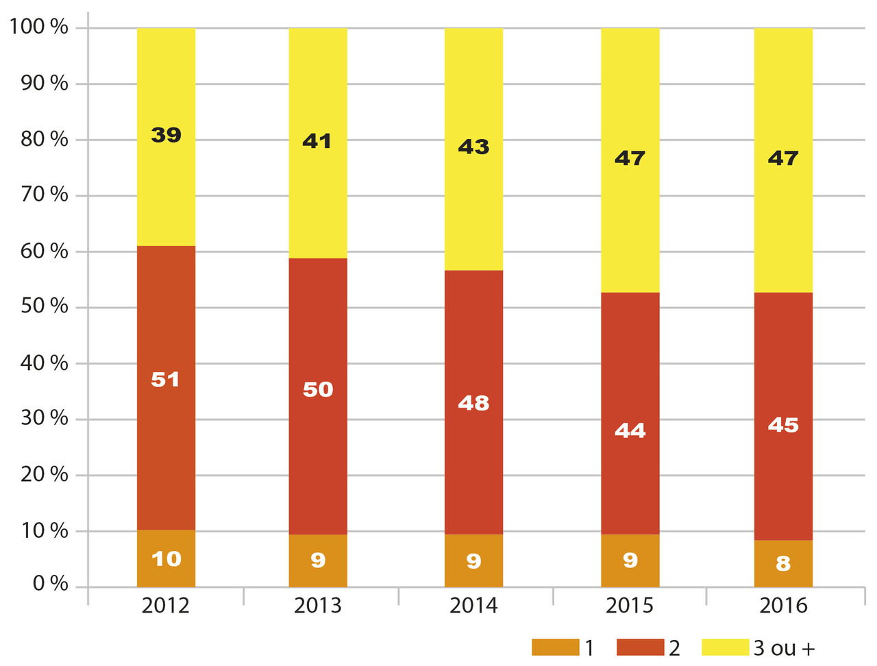 L’analyse de la répartition par tranche d’âge fait ressortir deux catégories majoritaires chez les oncologues radiothérapeutes : celle des 55-65 ans (31 % en 2012 vs 28 % en 2016) et celle des 35-45 ans (26 % en 2012 vs 28 % en 2016). Chez les physiciens médicaux, la tranche d’âge la plus représentée est celle de 30-40 ans (41 % en 2012 vs 42 % en 2016).