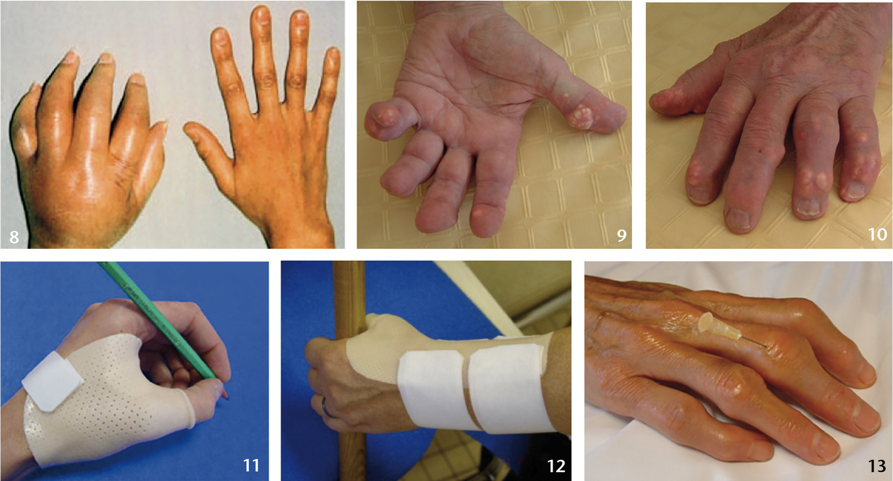 – douleurs souvent modérées de la face dorsale des articulations, d’horaire mécanique, à l’utilisation des doigts. Évoluant soit de façon chronique, soit par poussées d’allure inflammatoire accompagnées d’un dérouillage matinal de quelques minutes, elles sont entrecoupées de phases de rémission, même si la destruction articulaire radiologique est importante, donc sans parallélisme radio-clinique ;