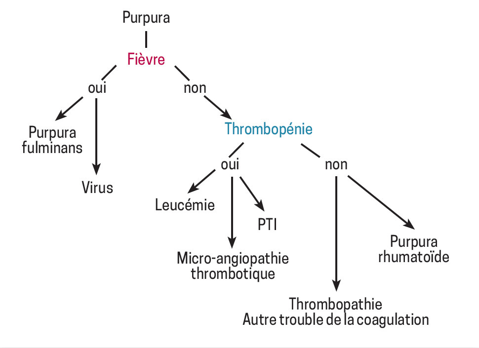 Tout purpura fébrile doit faire immédiatement évoquer un purpura fulminans. Une fois cette urgence vitale éliminée, les autres causes de lésions purpuriques sont envisagées. La démarche diagnostique distingue alors le purpura hématologique du purpura vasculaire, selon les signes cliniques et le bilan biologique de coagulation (fig. 3).