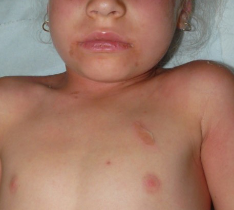 Un syndrome DRESS doit être évoqué devant l’apparition brutale d’une fièvre élevée mal tolérée avec malaises, d’un œdème facial, périorbitaire et du cou, d’un exanthème maculopapuleux prurigineux du tronc et de la racine des membres, voire d’une érythrodermie, et de polyadénopathies avec souvent une hépatosplénomégalie. L’atteinte buccale (énanthème ou pharyngite) peut être responsable d’une dysphagie. Plus rarement, l’atteinte cutanée peut comporter des pustules, des vésicobulles ou un purpura.Rare chez l’enfant, le diagnostic en est parfois retardé.Le bilan biologique recherche une hyperleucocytose avec lymphocytes atypiques, une hyperéosinophilie (souvent supérieure à 1,5 G/L), une cytolyse hépatique ou une atteinte rénale.