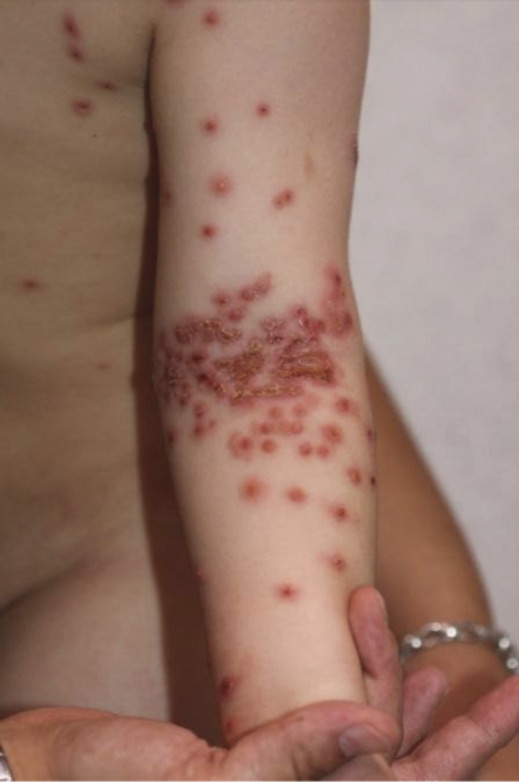 L’eczéma coxsackium correspond à une surinfection des lésions de dermatite atopique chez des enfants d’âge préscolaire par les virus Coxsackie (le plus souvent les souches A6 et A16), souvent au printemps et en été. La symptomatologie est très proche de celle de l’eczéma herpeticum : éruption vésiculeuse, bulleuse ou érosive au niveau des zones atteintes par la dermatite atopique, et plus spécifiquement au niveau des mains, des pieds, du visage (notamment en péribuccal), du tronc, des fesses et de l’aine (fig. 9). Les ulcérations buccales sont plus fréquentes que dans l’eczéma herpeticum, rendant parfois l’alimentation compliquée et pouvant motiver une hospitalisation pour réhydratation. La fièvre est moins élevée, et l’état général plus volontiers conservé. L’évolution est simple, similaire à celle du syndrome pieds-mains-bouche classique, sans séquelles graves à long terme. En cas de doute avec le diagnostic d’eczéma herpeticum, un traitement antiviral oral par aciclovir peut être initié, mais il sera inefficace contre le virus Coxsackie.