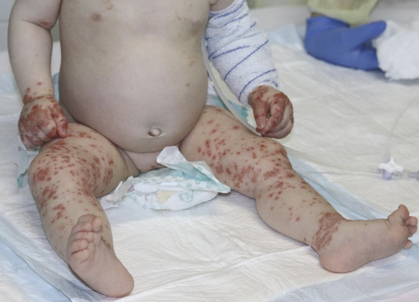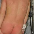 - éruption cutanée polymorphe : exanthème urticarien avec pseudococardes, morbiliforme, scarlatiniforme ou purpurique ; fréquente atteinte du siège (érythème « en culotte » bien limité, parfois douloureux, rapidement suivi d’une desquamation périnéale) (fig. 10).