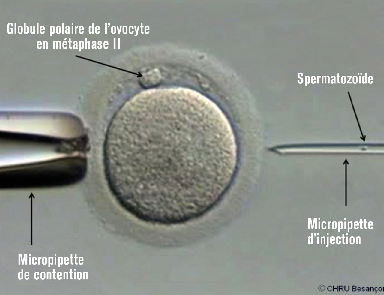 Avant son injection dans le cytoplasme ovocytaire, le spermatozoïde est ralenti avec un milieu visqueux (généralement à base de polyvinylpyrrolidone [PVP]). Il est ensuite immobilisé avec la pipette de micro-injection en fragilisant son flagelle. Cette pipette de micro-injection permet d’injecter le spermatozoïde entier dans le cytoplasme ovocytaire en traversant la zone pellucide, l’espace périvitellin et la membrane plasmique ovocytaire. L’ovocyte, quant à lui, est maintenu lors de la micro-injection par une pipette de contention (