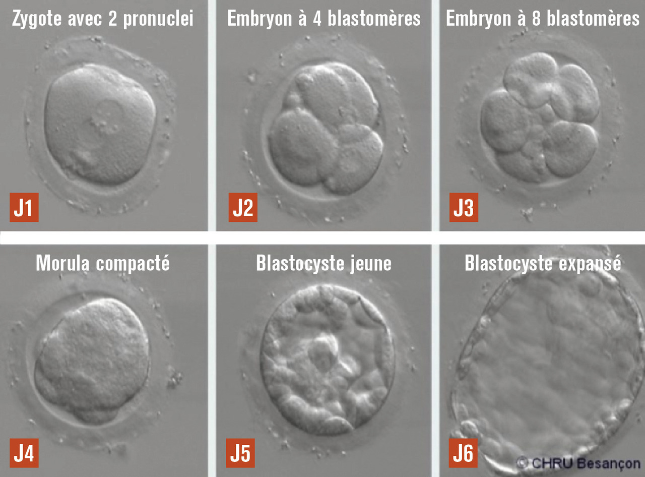 Le surlendemain (J2), si l’ovocyte a été fécondé, l’embryon est en général au stade de quatre blastomères (