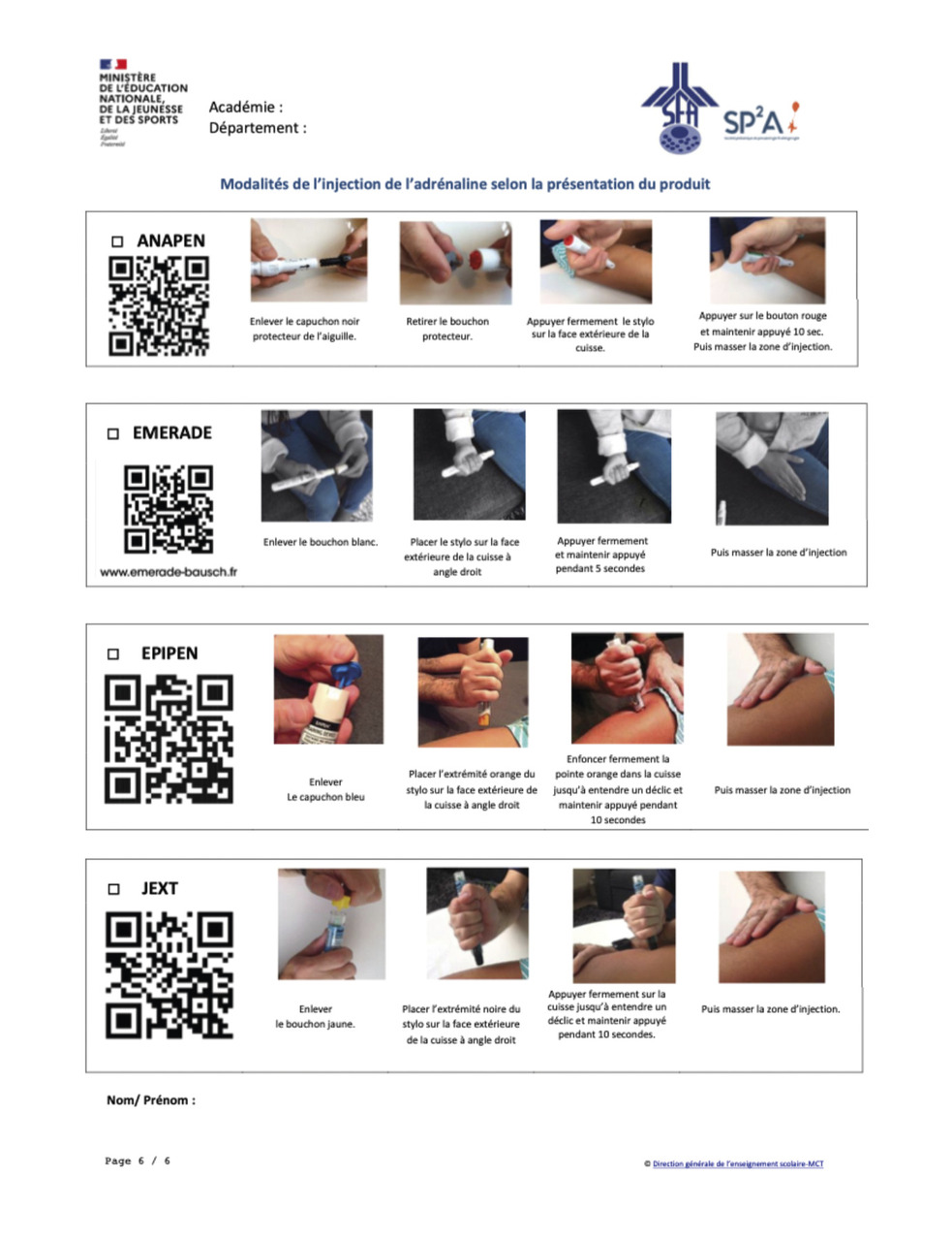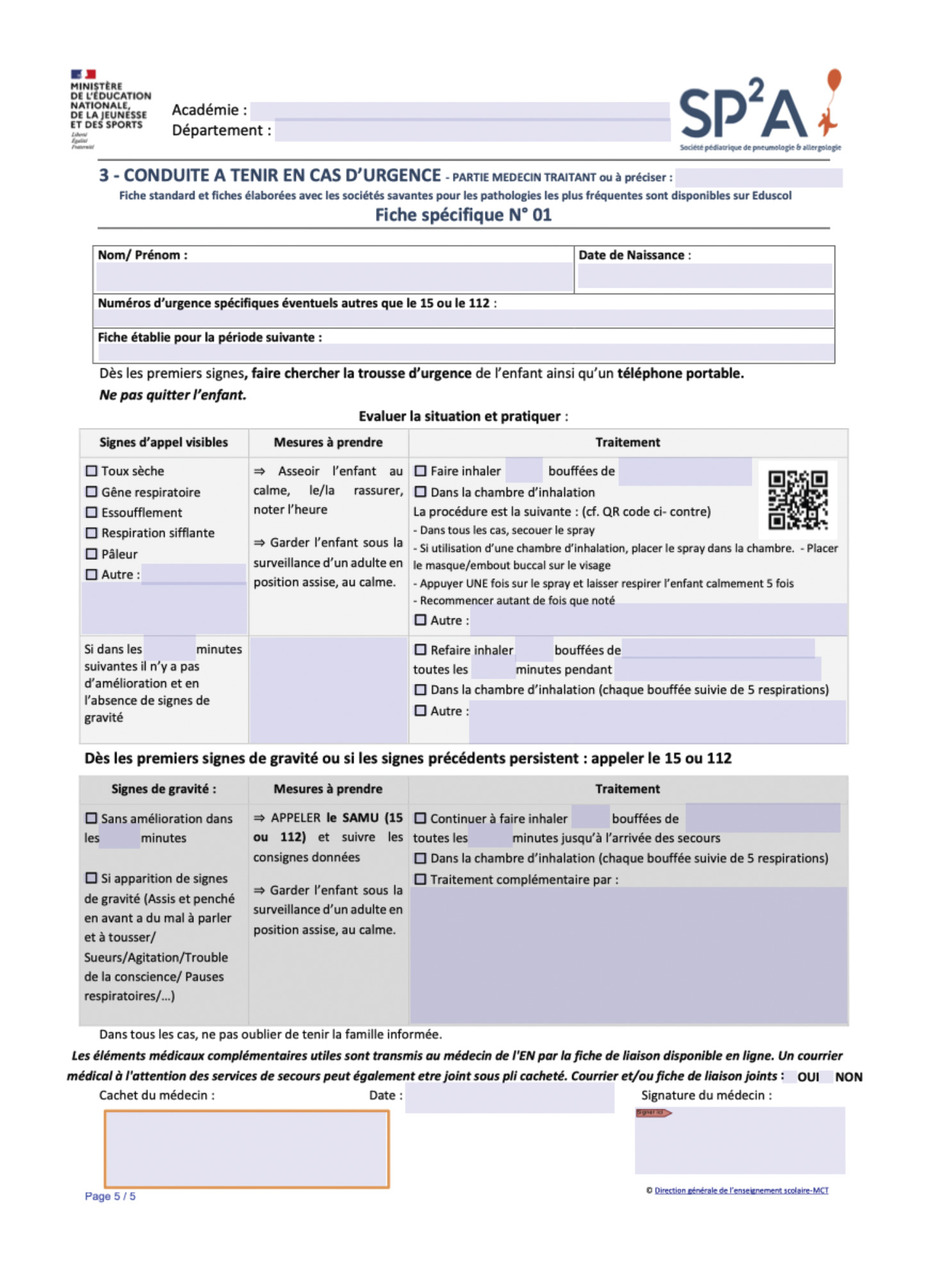 Des vidéos de démonstration pour l’utilisation des stylos auto-injecteurs d’adrénaline – permettant de sensibiliser le personnel en charge de l’enfant – sont disponibles par QR code sur le modèle de PAI proposé par la Société pédiatrique de pneumologie et allergologie (SP²A) [