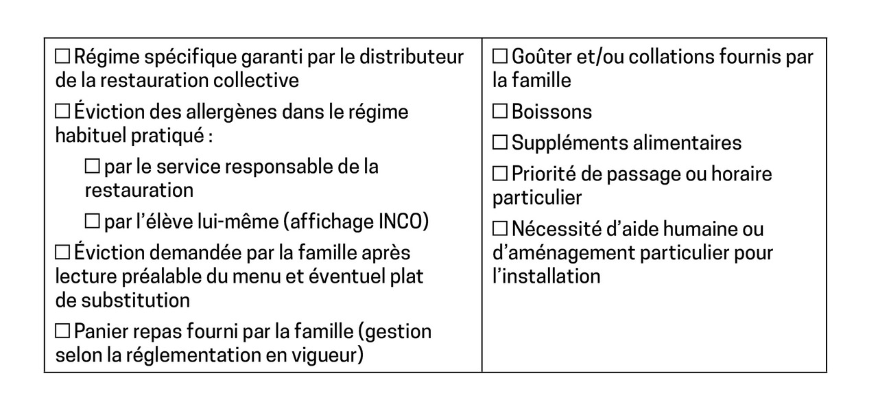 - la prescription d’un régime alimentaire éventuel, et les modalités de prise des repas en cantine scolaire : possibilité de menu courant avec éviction simple, menu avec panier-repas préparé par les parents, plateau sans allergène, contre-indication de certains aliments, etc. (