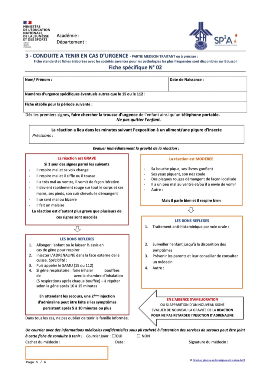 En cas d’allergies alimentaires, la trousse d’urgence doit contenir un document détaillant la conduite à tenir en cas d’urgence (
