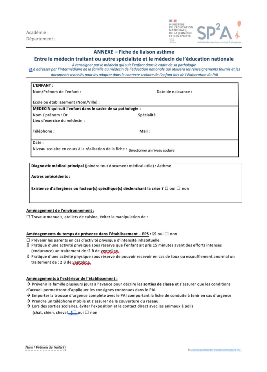 - les demandes d’aménagements spécifiques qu’il apparaît nécessaire de proposer dans le cadre de la pathologie : ateliers pédagogiques avec manipulation d’allergènes, prise en compte d’un asthme d’effort lors des cours de sport, etc. (